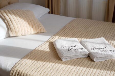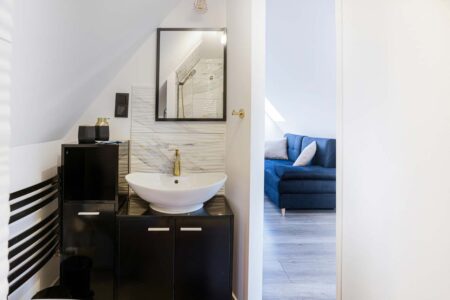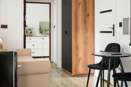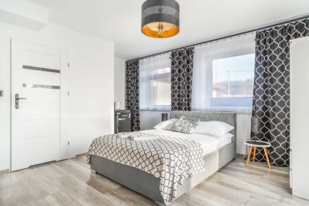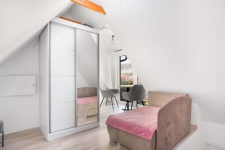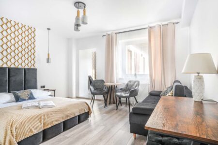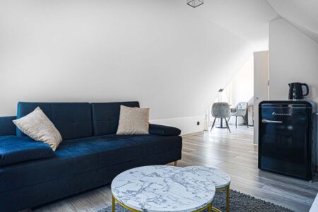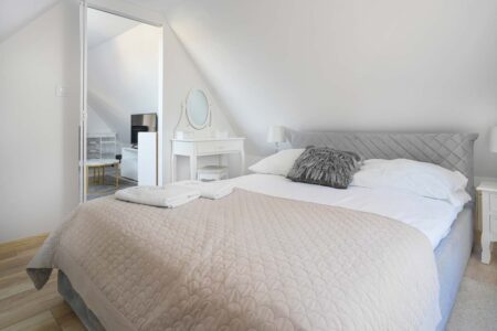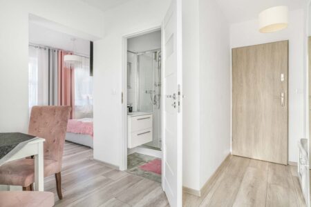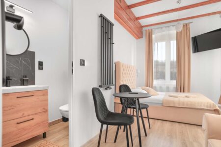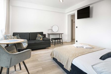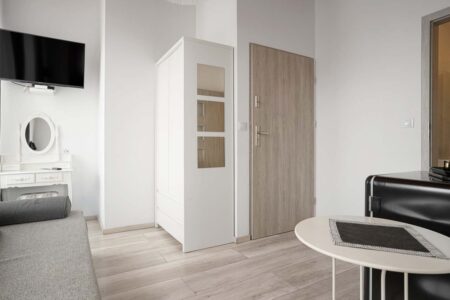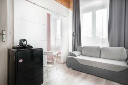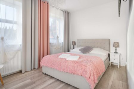 Jeśli cenisz sobie komfort i większą ilość przestrzeni na wyłączność, to z pewnością do gustu przypadnie Ci nasz apartament różowy, w którym mogą zamieszkać nawet 4 osoby. Składa się on z dwóch pomieszczeń. W pokoju głównym znajduje się rozkładana kanapa, stolik, czajnik, komoda i toaletka, zaś za przesuwnymi drzwiami umieszczono sypialnię z małżeńskim łóżkiem. Pokój posiada również prywatną łazienkę, zaaranżowaną w nowoczesnym stylu.