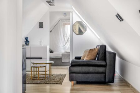 W apartamencie znajduje się dodatkowe pomieszczenie z wygodną sofą, idealne na chwilę relaksu czy wieczorny odpoczynek. Aneks kuchenny za ścianą to praktyczne rozwiązanie, umożliwiające przygotowywanie posiłków w dowolnym czasie. Apartament na parterze z wyjściem do ogrodu to doskonałe miejsce dla tych, którzy cenią sobie spokój, wygodę i bliskość natury podczas swojego pobytu.
