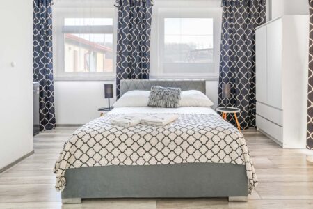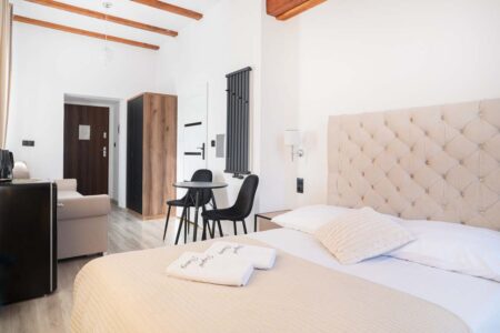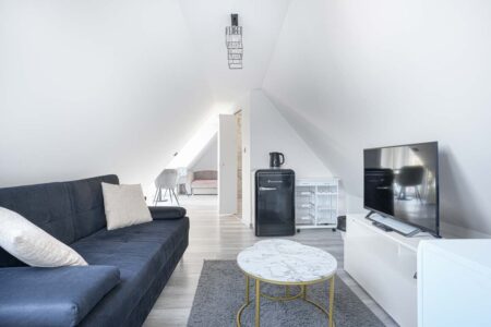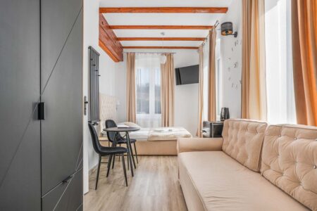 Nasz apartament Deluxe jest apartamentem o podwyższonym standardzie z dostępem do tarasu. Do dyspozycji gości pozostaje duży pokój z podwójnym łożem małżeńskim oraz rozkładaną sofą, a także łazienką. Wyposażony jest w telewizor, czajnik bezprzewodowy i lodówkę. Oprócz tego pozostawiamy do Państwa dyspozycji dwa – w pełni wyposażone – ogólnodostępne aneksy kuchenne, a także salę wyposażoną w mikrofalówkę oraz czajnik, z dostępem do bezpłatnej kawy oraz herbaty.