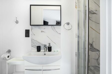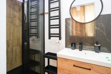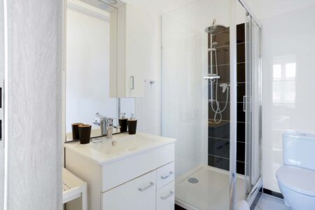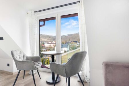 Apartament czteroosobowy na parterze to idealne miejsce dla rodzin lub grupy przyjaciół, pragnących cieszyć się komfortem i bliskością natury. Główne pomieszczenie zachwyca przestronnością i eleganckim wystrojem, tworząc przytulne miejsce do odpoczynku. Duże okna otwierają się na urokliwy ogród, gdzie goście mogą delektować się świeżym powietrzem i relaksować na krzesełkach zlokalizowanych w otoczeniu zielonych roślin.